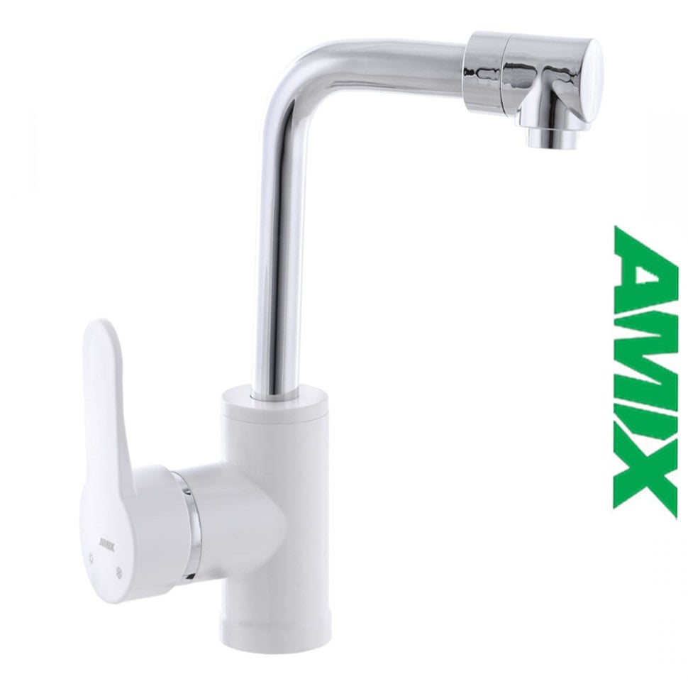 AMIX Mario-001 White - Компанія amix розробляє та виробляє широкий спектр недорогих та якісних кранів та змішувачів. Вартість моделі невисока, якщо порівнювати з аналогами. При цьому кран для умивальника прослужить довго. Змішувач умивальника комплектується аератором, що дозволяє заощаджувати воду. Модель виконана з термопластику, зручний важіль керування. Змішувач для раковини білий ремонтопридатний одноважільний - дрібні поломки можна усунути своїми руками. Кран має зовнішній тип монтажу, приєднується за допомогою гайки та гнучкої підводки, яка не йде разом із змішувачем.