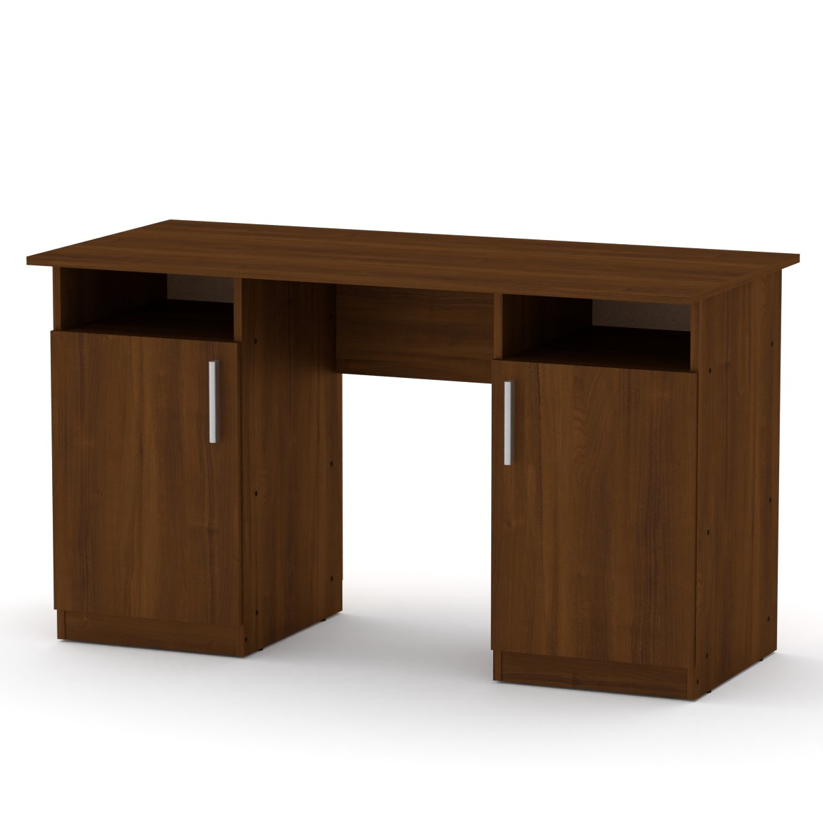 Письменный стол Учитель изготовленн из ламинированного ДСП, толщиной 16 мм, кромка ПВХ 0,5 мм. Устойчивый по своей конструкции стол с двумя тумбами и двумя открытыми полками под столешницей, расположенный симметрично от центра. Ниши можно использовать для бумаг или других предметов, которые должны быть под рукой. Такой стол создаст комфорт как в офисе, так и дома.