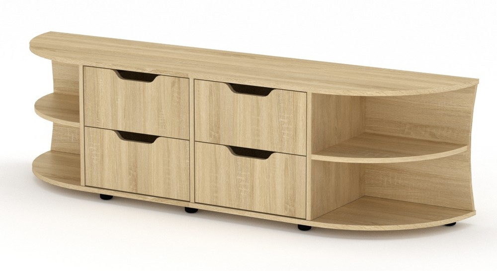 Тумба под ТВ Одесса изготовлена из ламинированного ДСП толщиной 16 мм. Открытая тумба под телевизор, оснащенная полочками для видеоаппаратуры и четырьмя выдвижными ящиками в центральной части, которые лекго вместят большое колличество необходимых вещей. Такая тумба станет прекрасным дополнением интерьера благодаря своему стильному дизайну.
