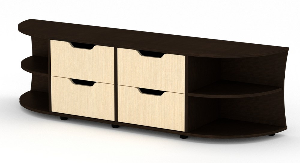 Тумба под ТВ Одесса изготовлена из ламинированного ДСП толщиной 16 мм. Открытая тумба под телевизор, оснащенная полочками для видеоаппаратуры и четырьмя выдвижными ящиками в центральной части, которые лекго вместят большое колличество необходимых вещей. Такая тумба станет прекрасным дополнением интерьера благодаря своему стильному дизайну.