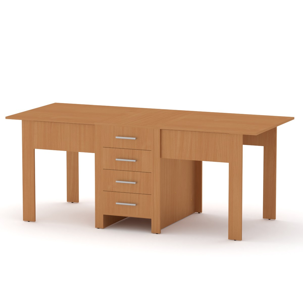 Корпус изготовлен из ДСП. Благодаря компактным размерам, стол книжка в собранном виде занимает малую часть площади комнаты. А в раскрытом состоянии за столом могут комфортно разместиться 10-12 человек.