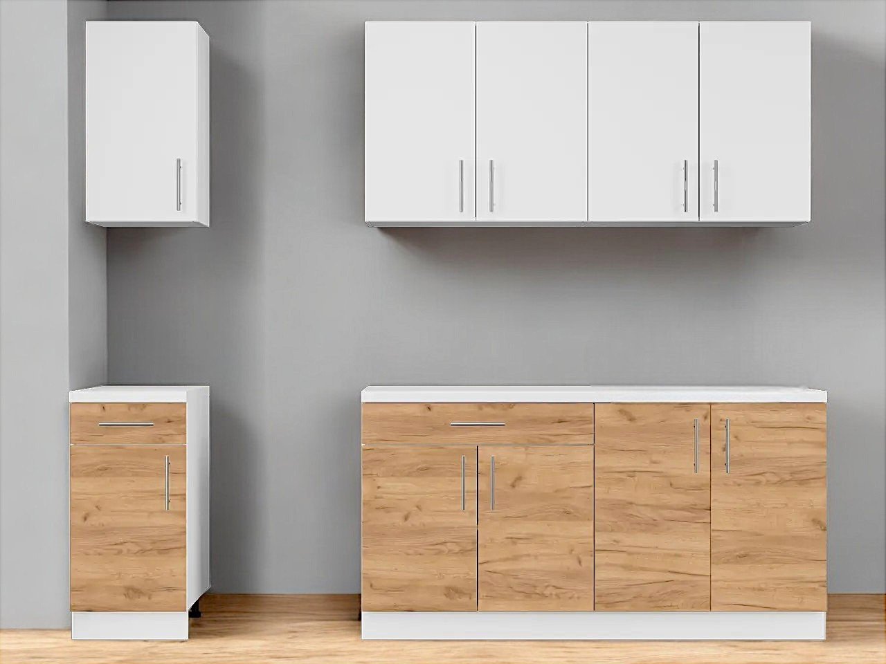 Модули изготовлены из высококачественной ламинированной ДСП толщиной 16 мм с прочной кромкой 0,5 мм на корпусе и 1 мм на фасадах. Ламинированная поверхность устойчива к повреждениям, воде и паре, поэтому прослужит много лет.