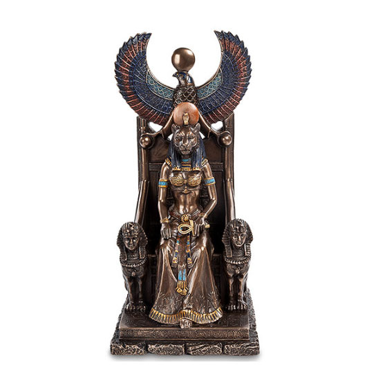 Также на голове у богини зачастую изображали диск солнца, так как богиня считалась оком верховного египетского бога Ра.