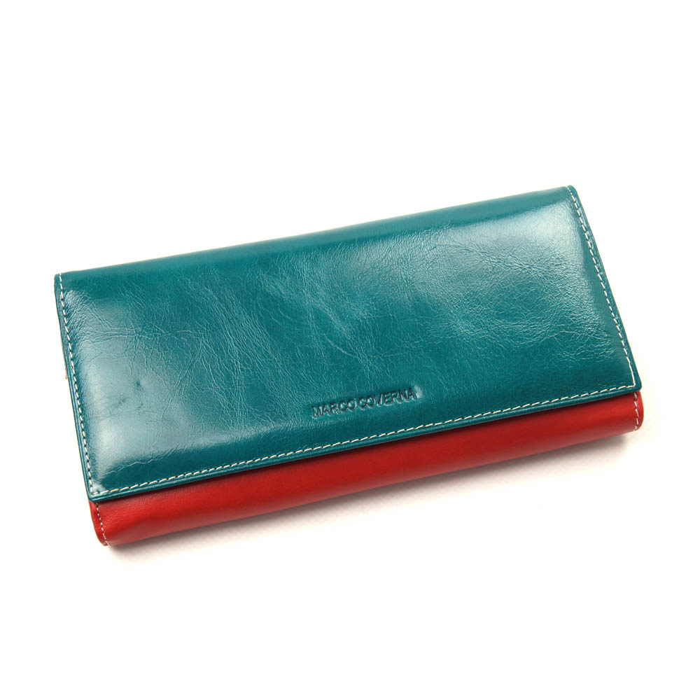 Материал: натуральная кожа Цвет: бирюзово-красный Размеры: ширина 19,5 см, высота 9 см, толщина 2,5 см Широкий разноцветный кожаный женский кошелек закрывается на магниты. С тыльной стороны кошелька есть широкий карман на молнии с расширителем и потайной внутренний карман. Внутри кошелька: 3 основных открытых отделения для купюр 1 дополнительное отделение-перегородка на молнии 2 потайных прилегающих широких кармана 12 ячеек под кредитные и дисконтные карточки 2 прозрачных отделения