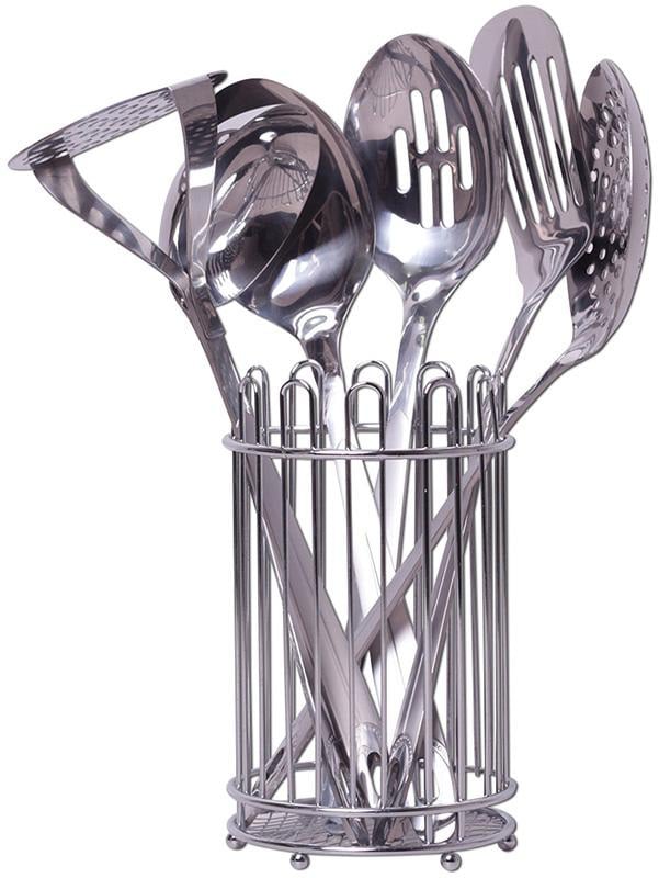 В наборе все самое необходимое на каждый день: Половник (28см), шумовка (32см), лопатка поварская (32см) с прорезями, ложка поварская (31см), ложка поварская (31см) с отверстиями, пресс для картофеля (29см).