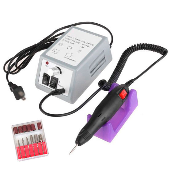 В комплекте: фрезер, блок питания, двигатель-ручка, подставка для ручки, фрезы: 6 штук с алмазным напылением для удаления кутикулы, мозолей и грубых частей кожи, для обработки края ногтевой пластины, тонкой шлифовки, обычной шлифовки, коррекции наращенных ногтей, чистки под ногтями, заключительной шлифовки.