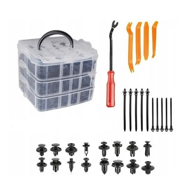 Набор универсальных автомобильных зажимов 9324 для крепления элементов кузова и облицовки. В набор входят 16 популярных и широко используемых зажимов. А также инструменты для снятия обшивки автомобиля.