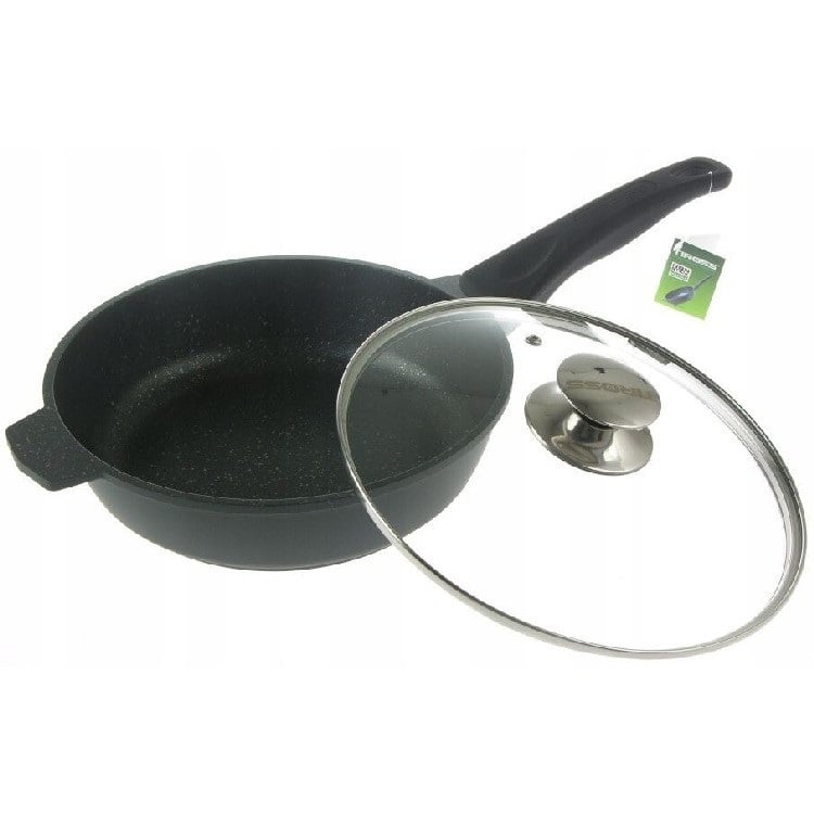 Использовать сковороду можно на всех видах плит, включая индукционные. Бакелитовая ручка не нагреваются. Крышка изготовлена из жаропрочного стекла.
