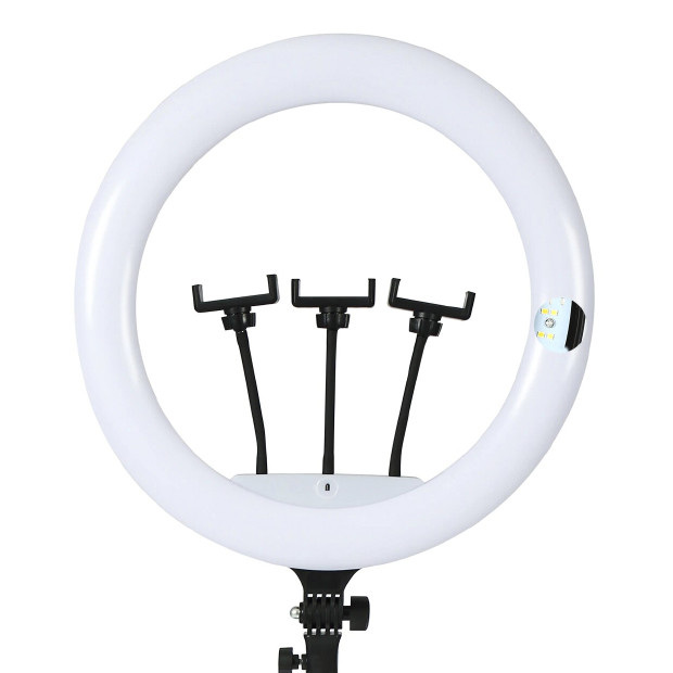 Ring Light JL-F348 7329 - это большая кольцевая лампа для создания селфи или фотографий. Лампа имеет большой диаметр - 45 см, благодаря чему она дает хорошее освещение, при этом яркость лампы можно регулировать с помощью пульта дистанционного управления. Для большего комфорта во время работы лампу можно крепить на штатив с помощью винта. В комплект к лампе идут три гибких держателя, на которых можно закрепить одновременно три телефона. Так же в комплекте есть кабель питания и удобная сумка-чехол с ручками, с помощью которой можно хранить и переносить светодиодную лампу.