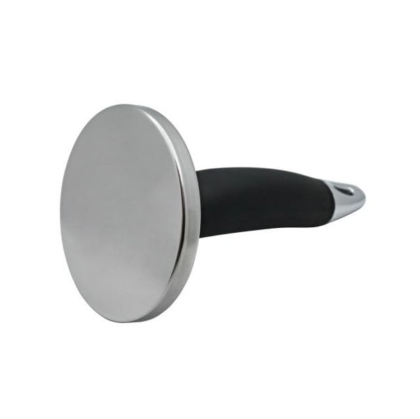 Пресс для мяса имеет широкое круглое основание и удобную ручку с отверстием для подвешивания.
