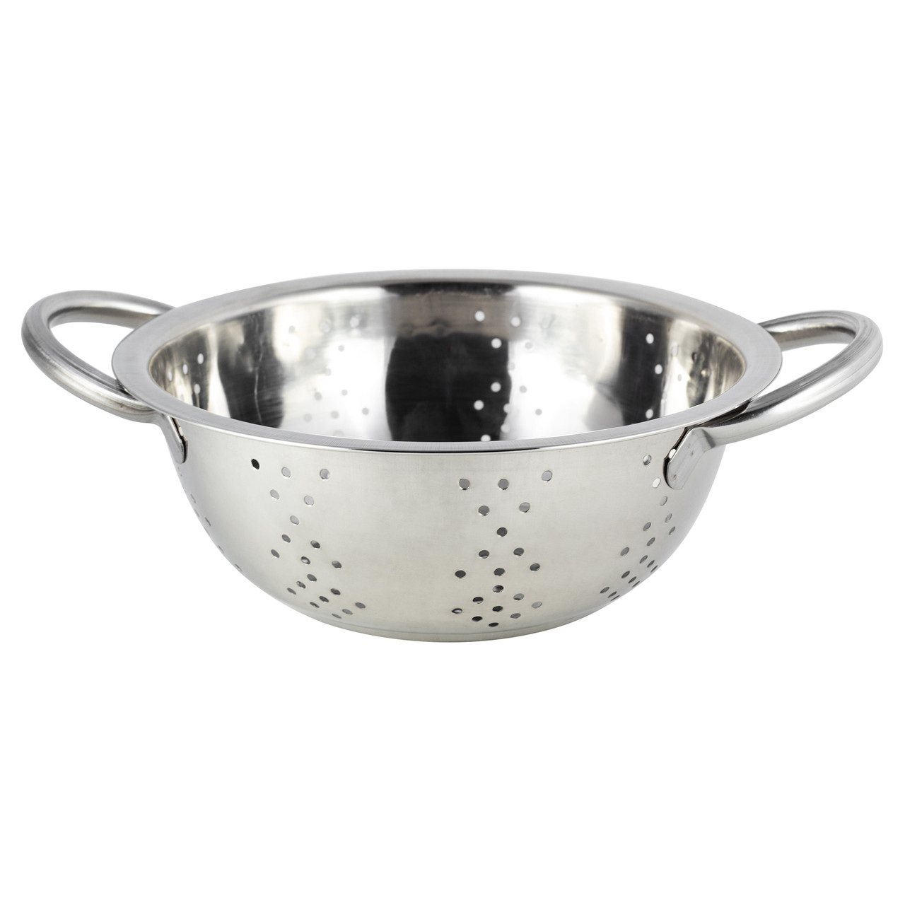 Дуршлаг необходимая вещь на кухне для приготовлении различных блюд, для отделения жидкости от твердых веществ, мытья и промывания ягод, грибов, мелких фруктов и овощей, а также отцеживания творожной сыворотки. Материал: нержавеющая сталь. Диаметр, см: 18