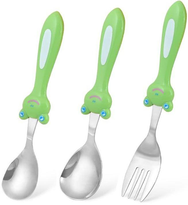 Набор столовых приборов для детей. Кормление маленьких непосед - процесс совсем непростой. Но с приборами серии Happy Kids это занятие превратится в увлекательное приключение как для ребенка, так и для родителей. Рабочая часть фраже выполнена из высококачественной нержавеющей стали, абсолютно безопасна для детского организма. Задорный детский дизайн. Салатовые пластиковые ручки в виде веселой лягушки. С такими приборами кормление Вашего малыша станет проще и интересней. Кроме того, ребенок проявит стремление научиться кушать самостоятельно. В наборе: 1 вилка и 2 ложки разного размера. Можно мыть в посудомоечной машине. Забавные приборы поднимут настроение малышу и усилят его аппетит. Набор упакован в фирменную подарочную коробку.