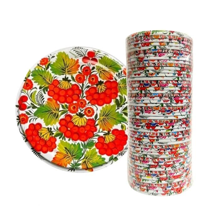 Металлические автоклавные крышки для консервации Панночка СКО-20ПП серия Петриковка. Тип: Автоклавная СКО (под закаточный ключ); Диаметр: 82 мм; Материал: пищевая жесть; Толщина металла: 0,20 мм. Практические и надежные автоклавные крышки Панночка с литографической полноцветной печатью красочных изображений петриковских образцов, отличаются своим ярким дизайном. Они производятся из качественной пищевой жести с двойным наружным покрытием пищевого лака и литографии и внутренним - пищевой эмали и лака. Материалы, которые используются для защиты, сертифицированы и экологически чисты. За счет этих свойств такие металлические закаточные крышки характеризуются длительным сроком годности.