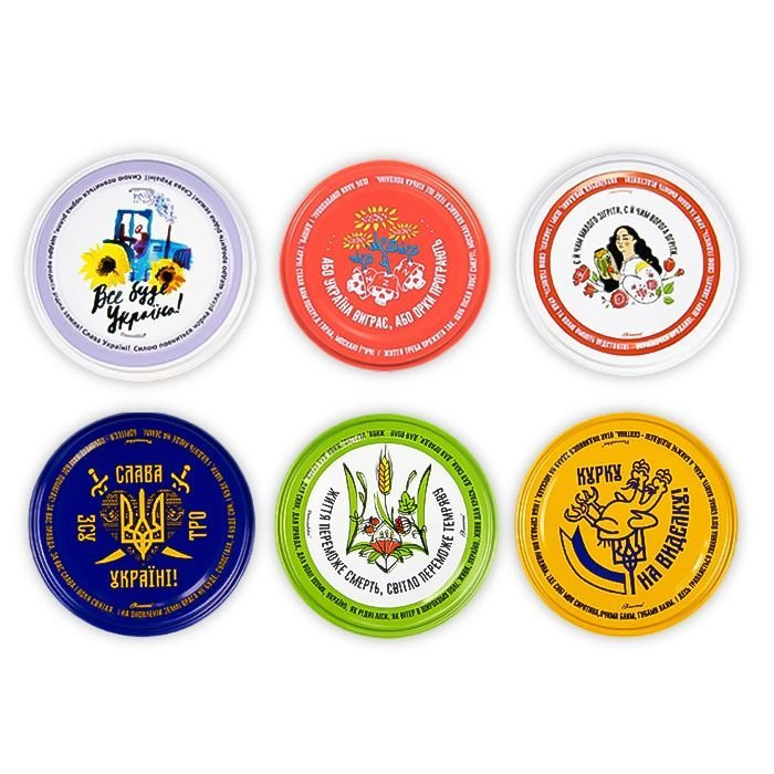 Металлические крышки для консервации Панночка СКО серия Патриотическая mix. Тип: СКО (под закаточный ключ); Диаметр: 82 мм; Материал: пищевая жесть; Толщина металла: 0,18 мм. Практические и надежные крышки Панночка с литографической полноцветной печатью красочных патриотических изображений, отличаются своим ярким дизайном. Они производятся из качественной пищевой жести с двойным наружным покрытием пищевого лака и литографии и внутренним - пищевой эмали и лака. Материалы, которые используются для защиты, сертифицированы и экологически чисты. За счет этих свойств такие металлические закаточные крышки характеризуются длительным сроком годности.