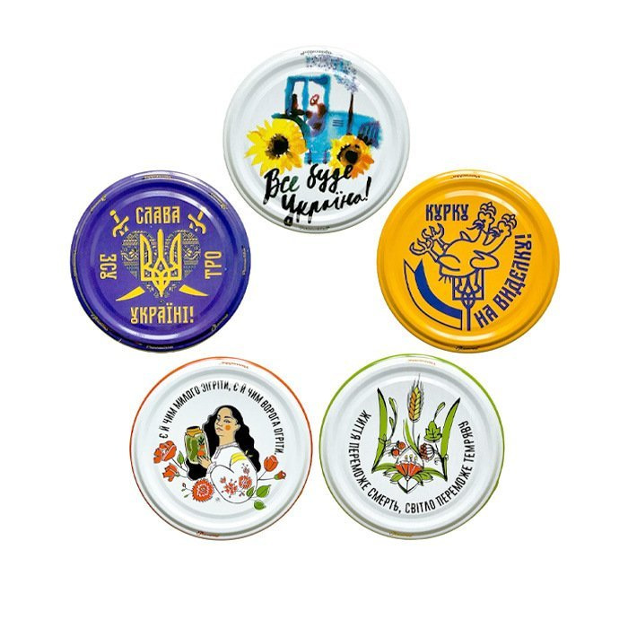 Крышки с патриотическим принтом. При изготовлении крышки используется качественная пищевая жесть, в соответствии с требованиями ГОСТа для производства крышек данного типа. На внутренний этаж нанесено лаковое покрытие, надежно защищающее крышку от коррозии, а содержимое банки от продуктов окисления крышки.