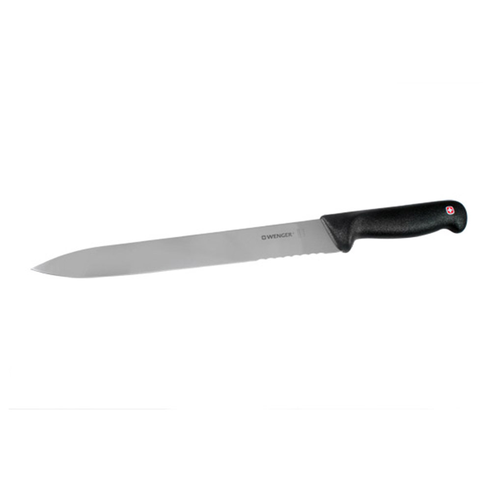 Линейка профессиональных ножей Grand Maitre от Wenger — первоклассные ножи для истинного ценителя кулинарного искусства. Особая высококачественная сталь, отполированная до зеркального блеска, ручная заточке режущей кромки, нескользкая эргономичная безопасная рукоятка, непосредственно влитая в нож, — делают ножи долговечными и годными к стерилизации. Ножи Grand Maitre имеют отличные режущие характеристики. Профессиональный нож Wenger Grand Maitre для нарезки с длинным гибким лезвием с заостренным концом и частичной серрейторной заточкой предназначен для нарезания тонких кусков любых видов приготовленного мяса. Лезвие изготовлено из высококачественной нержавеющей стали, обладает высокой устойчивостью к коррозии, долго остается острым. Рукоять из полиамида максимально гигиенична, не скользит, удобно лежит в руке. Нож отлично сбалансирован и долго остается острым. Подходит для мытья в посудомоечной машине.