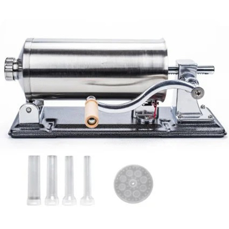 311005 Шприц колбасный ГОРИЗОНТАЛЬНЫЙ Browin на 5 кг Шприц колбасный 5 кг - это недорогой, очень удобный и простой в обслуживании колбасный шприц для домашнего приготовления колбас, сарделек и сосисок. С его помощью вы легко и быстро заполните начинкой колбасные оболочки практически всех калибров и видов. В процессе набивки фарш не нагревается, что позволяет избежать бульонных отеков. Позволяет сохранить структуру фарша в отличии мясорубки. Шприц имеет горизонтальное крепление и занимает достаточно мало места на столешнице. Нижняя ножка - идет в виде присоски, которая надежно крепит шприц к поверхности стола. Применение: Рекомендуется промыть шприц перед первым использованием теплой водой. Привинтите переднюю кольцевую юбку и монтажную опору воронки вместе с соответствующей воронкой на стальной контейнер. С помощью входящего в комплект винта установите кривошип на спиралевидный стержень, а затем привинтите заднюю кольцевую юбку на конце стержня с дисковым наконечником. Заполните стальной контейнер начинкой. Установите устройство на ровную устойчивую поверхность, такую как столешница или стол, и прикрепите стойку шприца к столешнице или столу зажимами. Проверьте устойчивость креплений шприца. Вставьте спиральный стержень с задней кольцевой юбкой и установленным кривошипом в алюминиевый контейнер с начинкой, и крепко привинтите его сверху. После заполнения шприца и надежного закрепления его на поверхности начинайте работать. Характеристики: Материал корпуса: нержавеющая сталь Материал насадок: пластик Размеры шприца: 87 x 29 x 31 см Диаметр насадок: 17; 21; 25; 29 мм Привод механизма: ручной Тип загрузки: горизонтальный Объем: 5 кг фарша. Вес: 4,9 кг Комплектация: Шприц колбасный 4 пластиковых насадки диаметром: Ø 17/21/25/29 мм Инструкция Упаковка: заводская коробка Инструкция по применению колбасного шприца, 5 кг