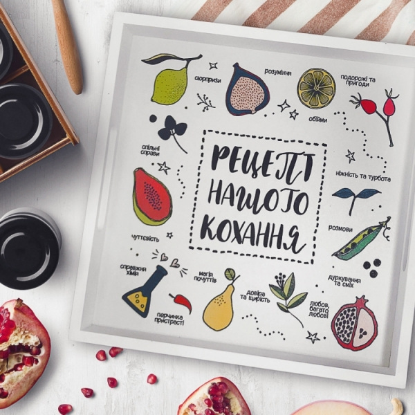 Поднос Рецепт нашого кохання Удобный деревянный поднос с двумя ручками. Имеет оригинальный и яркий принт. Будет отличным подарком! Поднос нельзя мыть в посудомоечной машине и ставить в микроволновку.