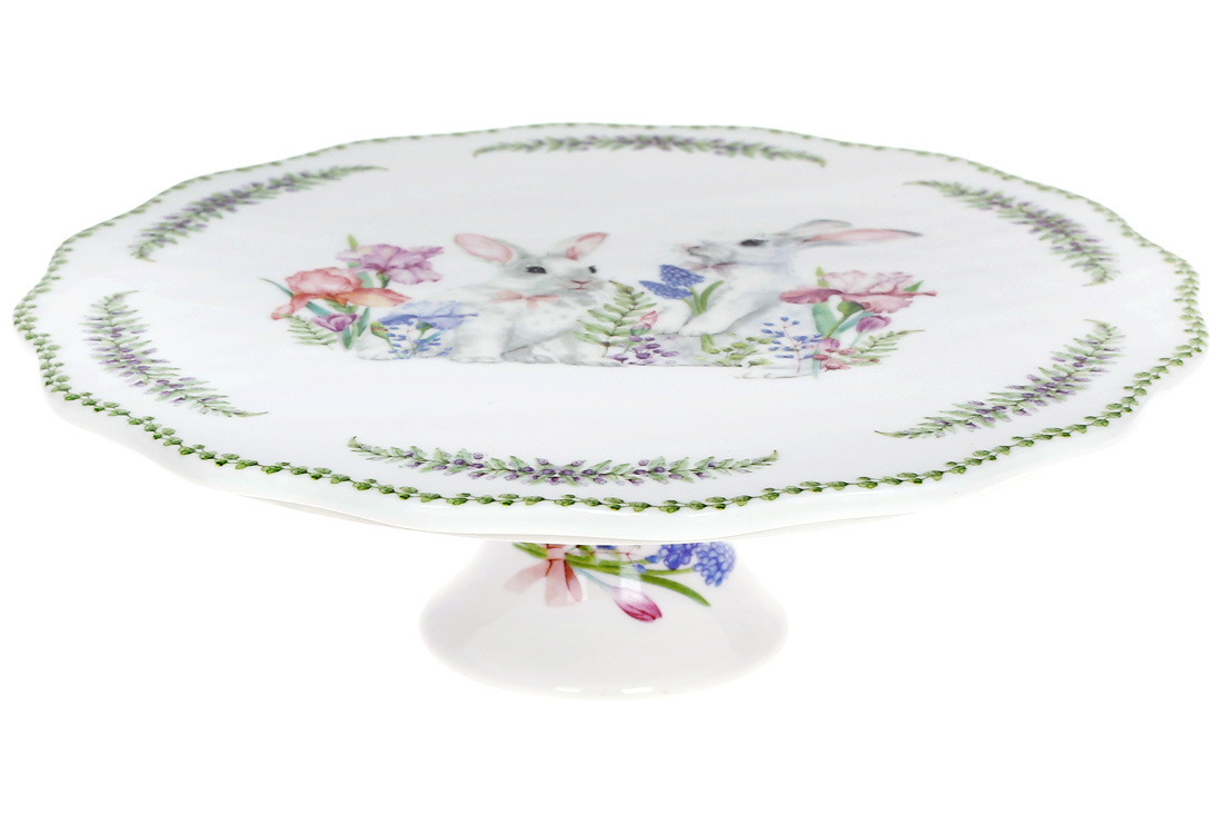 Подставка для торта (блюдо на ноге) "Весенняя история"- чудесная коллекция фарфоровой сервировочной посуды с весенними мотивами. Белый фарфор с нежным рисунком зайчат в весенних цветах. Диаметр блюда 25см. Подставка для торта упакована в фирменную подарочную коробку.