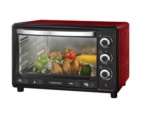 Духовка настольная Liberton LEO-480 Red является электрическим прибором мощностью 2 кВт. Её внутренняя камера объёмом 48 литров выполнена из нержавеющей стали и закрывается дверцей с одним стеклом. Модель работает с тремя режимами нагрева с максимальной температурой 250С. Равномерное распределение горячего воздуха по всему внутреннему объёму обеспечивает вентиляционная конвекция, благодаря чему продукты нагреваются одинаково со всех сторон. В приборе имеется функция гриля и яркая внутренняя подсветка. С помощью таймера на 60 минут можно задать время работы устройства, после окончания которого раздаётся звуковой сигнал. Комплектуется настольная духовка Liberton LEO-480 Red решёткой для гриля, противнем и ручкой для дека.