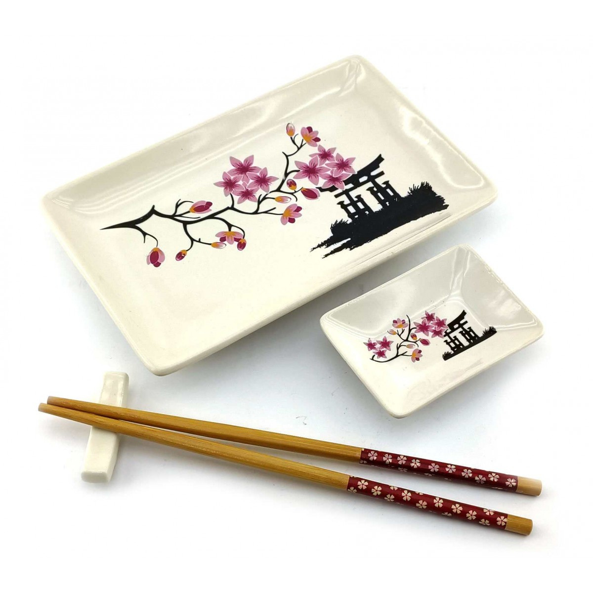 Набор рассчитан на одну персону, в наборе керамическая тарелка прямоугольной формы. Легкие и гладкие бамбуковые палочки, которые не размокают и не деформируются при правильном хранении. Керамическая подставка для палочек. Керамическая соусница.