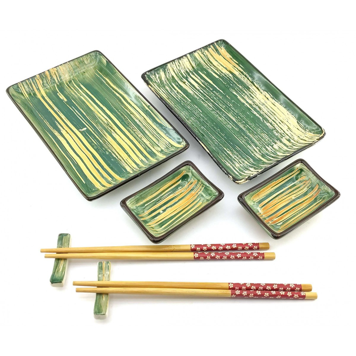 Набор рассчитан на две персоны, в наборе две керамические тарелки прямоугольной формы. Легкие и гладкие бамбуковые палочки, два комплекта, которые не размокают и не деформируются при правильном хранении. Две керамические подставки для палочек. Две керамические соусницы.