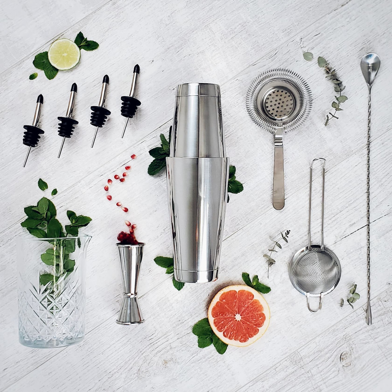 Набор бармена в подарочной упаковке. Все, что необходимо для создания коктейлей. В набор входят: Шейкер- два стакана из нержавеющей стали 750 мл. и 550 мл; Джиггер 50/25 - нержавеющая сталь, две емкости с метками 50/35/25/15 мл; Смесительный стакан - прочный стакан из стекла 725 мл; Стрейнер - стрейнер хавторн с пружинкой, диаметр 100 мм, нержавеющая сталь; Файн стрейнер - барное сито для двойной фильтрации, диаметр 75*40 мм; Гейзер 4 шт. - серебристого цвета; Барная ложка- из нержавеющей стали, наконечник в форме капли, 30 см длина, 5 мл объем; Подарочная упаковка - фирменный коробок