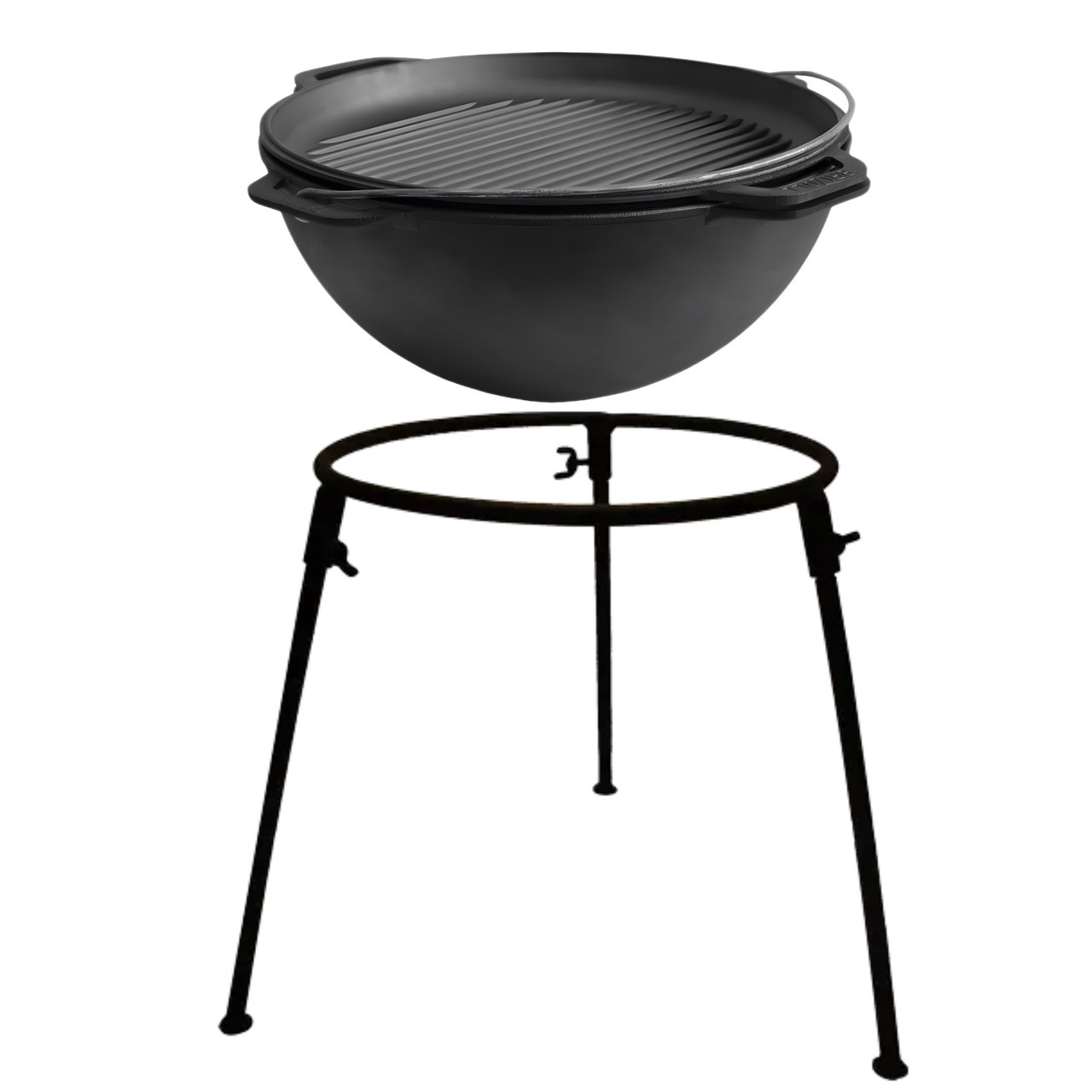 Большой азиатский чугунный казан ТМ BRIZOLL емкостью 15 л с крышкой сковородой-гриль (на фото). Предназначен для приготовления блюд на костре или мангале, требующих тушения, томления и приготовления в собственном соку.