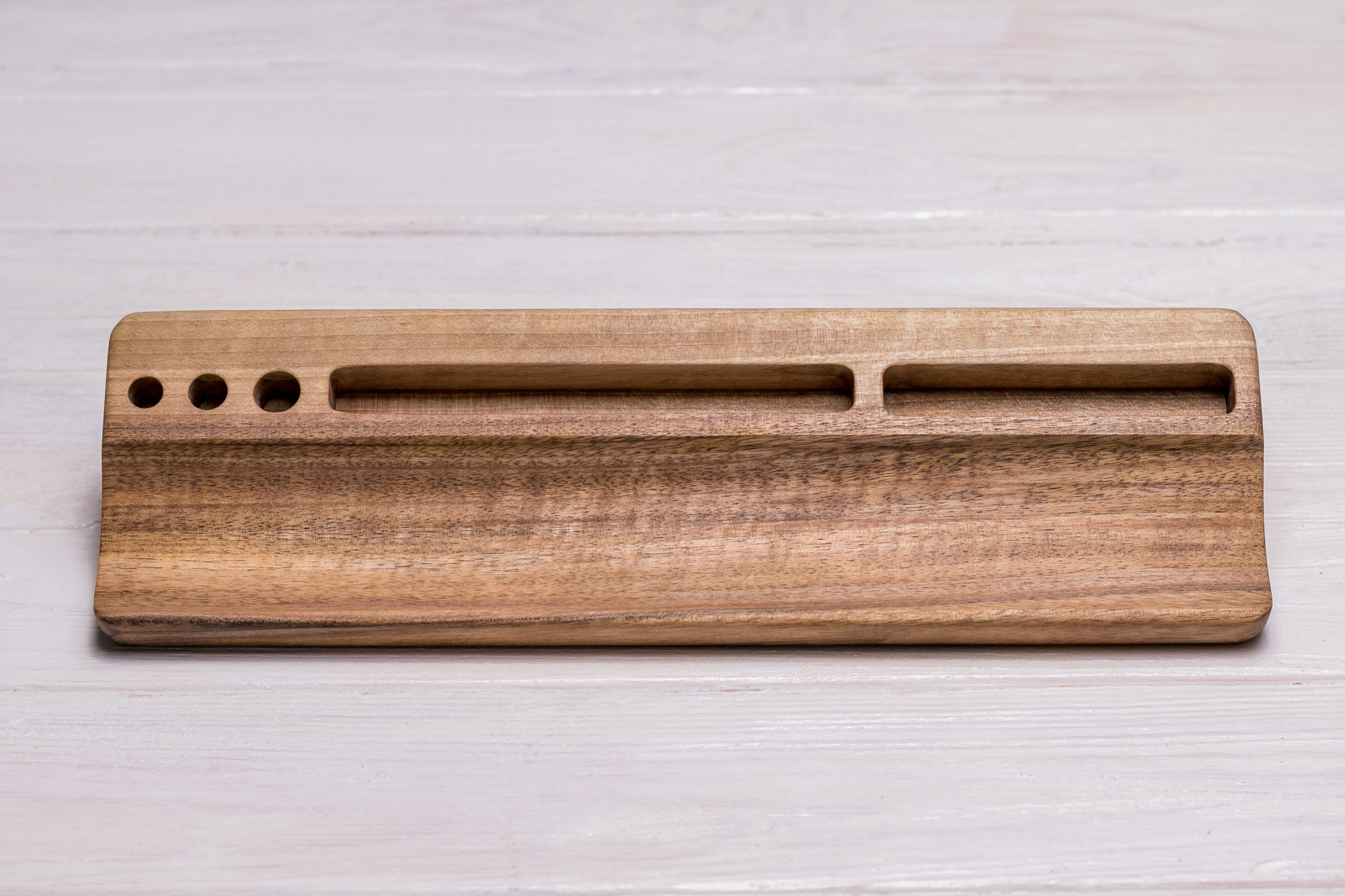 Часто бывают ситуации, когда на рабочей поверхности стола совсем мало места, так как все занято разными мелочами. Именно для этих целей компания EcoWalnut разработала небольшой, но очень практичный аксессуар под названием "Компакт". В этом органайзере найдется место для ключей, визиток, ручек и прочих мелких канцтоваров. Также у Вас есть возможность разместить на данной подставке свой телефон (правый паз длиной 90 мм) или небольшой (левый паз длиной 142 мм) планшет, чтобы они всегда были у Вас под рукой. Органайзер сделан таким образом, чтобы не опрокидываться назад под весом гаджетов. Особенность этого аксессуара состоит в том, что сам органайзер очень компактен, что позволяет экономить место на рабочем столе. Будь то День рождения, годовщина или любой другой случай, Вы можете смело рассчитывать, что наш органайзер вызовет улыбку на лице получателя.