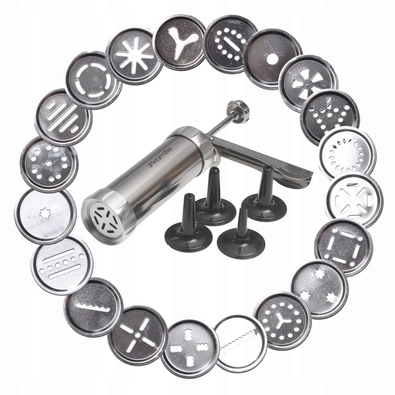 Описание Пистолет-шприц кондитерский для печенья и крема Kamille 24 насадки Серебристый (3009)