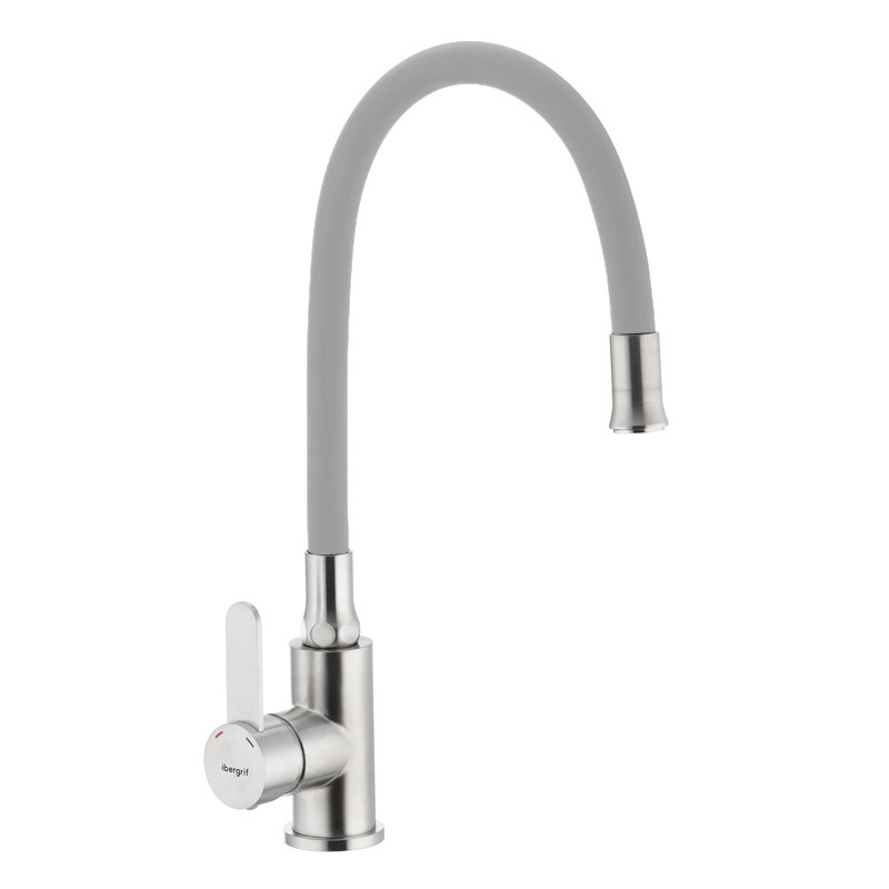 Одноручковый смеситель для кухни IBERGRIF M22119-9 с силик. изл. из нерж. cт. SUS304 (цв. излива серый) изготовлен из нержавеющей стали SUS 304, которая отличается низким содержанием в составе углерода и отсутствием свинца. Она устойчива к коррозии и воздействию химических веществ. Крепится на одно отверстие (мойка, столешница, подоконник) на гайку.