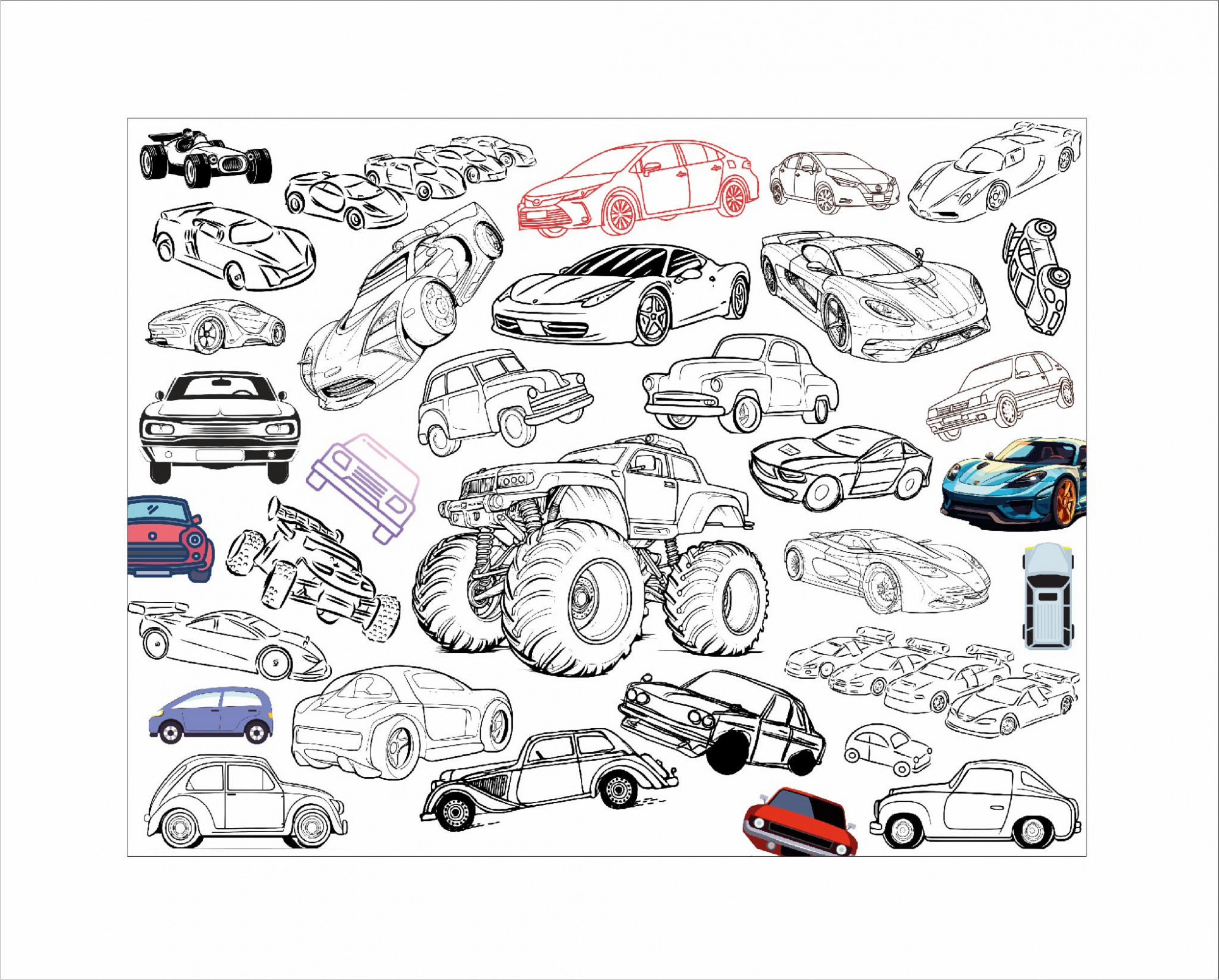 Раскраска «Машинки» – это идеальный выбор для юных поклонников техники. На страницах представлены различные модели машин: от классических автомобилей и ретро-стиля до современных спортивных автомобилей и больших монстр-траков. Благодаря детализированным контурам каждый малыш сможет проявить фантазию, раскрашивая любимые машины в собственные цвета. Раскраска способствует развитию творческого мышления, внимательности и мелкой моторики. Особенности:Особенности: