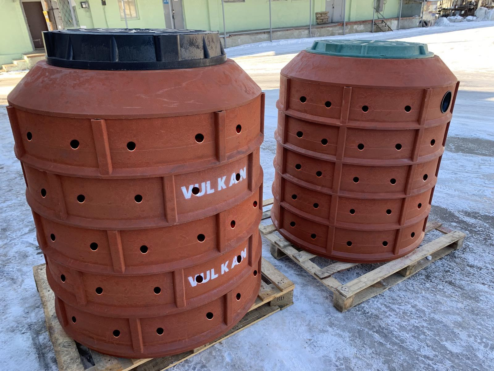 Композитные колодцы VULKAN - (ВУЛична КАНалізація) это прежде всего смотровые колодцы благодаря своему диаметру 1000 мм. Отдельные элементы монтируются в канализационную конструкцию, в которой можно провезти очистку каналов, а так же осуществлять контроль работы системы.