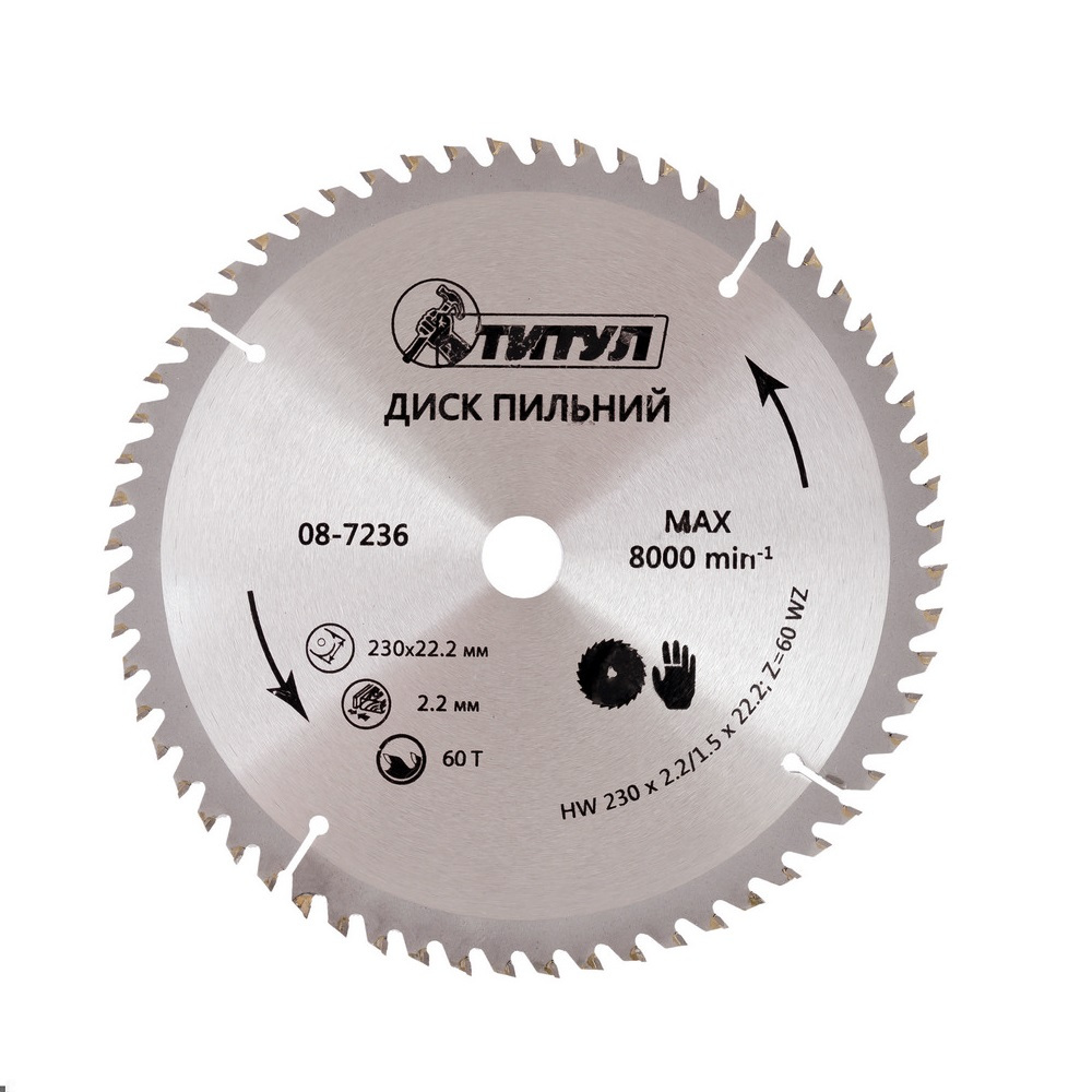 Характеристики товара Диск пильный для дерева с твердосплавными напайками ТИТУЛ 230х22.2х60Т (08-7236)