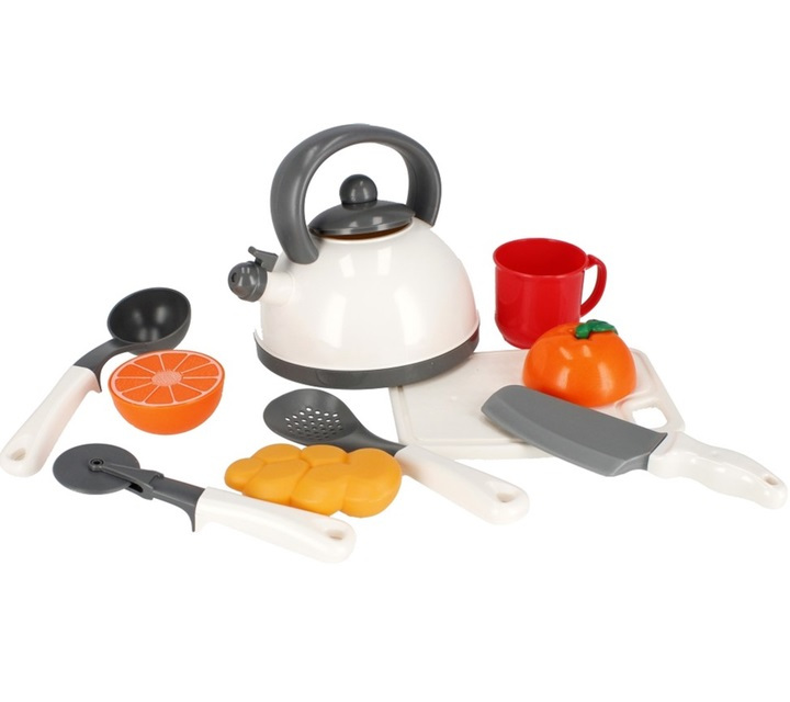 - набор состоит из плиты, чайника, чашки, столовых принадлежностей, продуктов и дощечки;