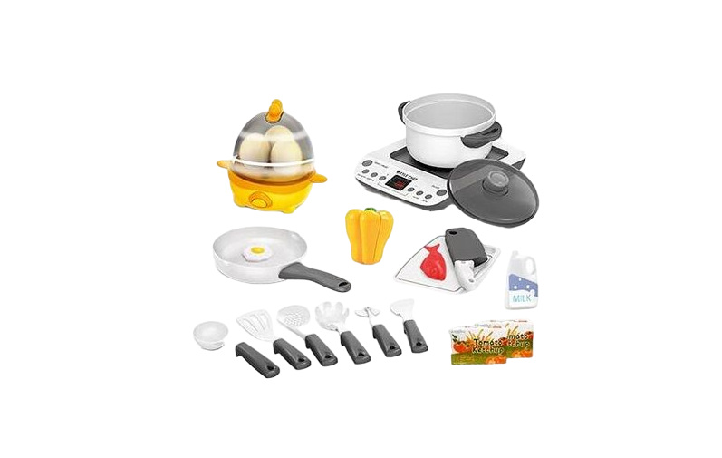 Современная игрушечная кухня, которая не только познакомит ребенка с главными правилами приготовления пищи, но и пробудит интерес к кулинарии. Тематическая игра будет максимально реалистичной, ведь кроме посуды и набора продуктов набор включает 2 устройства со звуковыми и световыми эффектами - яйцеварка и настольная электрическая плита. Во время работы платформа яйцеварки вращается по кругу и подсвечивается, раздается громкий тематический звук. Настольная плита с одной конфоркой тоже отличается разными эффектами: подсветка, электронное табло, регулировка температуры и целых 6 программ приготовления. При работе каждой программы раздаются соответствующие характерные звуки.