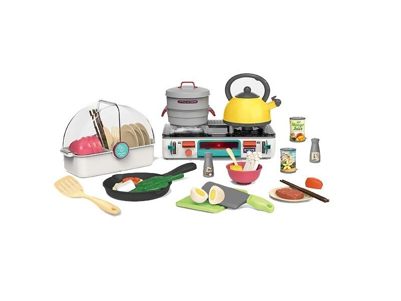 Кулинарное приключение начинается с яркого игрового набора, с которым у ребенка не будет времени на скуку. Здесь есть все: от плиты с двумя газовыми конфорками до чайника, сковороды, столовых принадлежностей и пищевых продуктов. Пространство для игры просто огромно! Как только ребенок включит одну из конфорок, он воспроизведет звуковой эффект, подсветится красным светом, имитируя огонь, а затем постепенно появится холодная пара, которая сделает процесс приготовления еще более реалистичным.