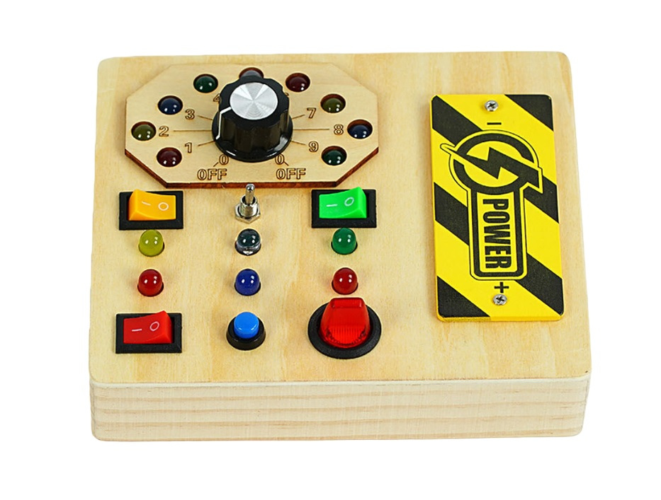 Развивающая доска для самых маленьких, которая познакомит малышей со светом. Бизиборд включает в себя множество маленьких лампочек, которые нужно включить с помощью переключателей. Цветная подсветка легко привлечет малыша и поможет развить мелкую моторику ручек. Бизиборд выполнен из натурального дерева и имеет компактные размеры.