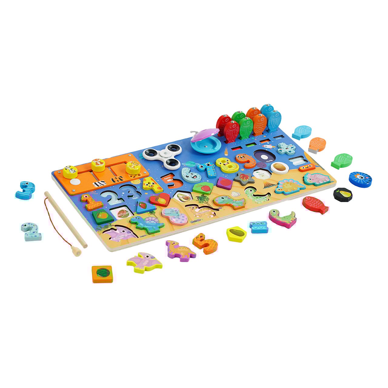 Подарите своему ребенку отличный ресурс для раннего развития в виде этой яркой многофункциональной доски. Эта игрушка позволит малышу изучить цифры, формы и цвета и больше узнать о доисторических динозаврах со стилизованными иллюстрациями древних ящуров. Доска также включает в себя элементы бизиборда с пальчиковой игрой и фиджетами. К игре также добавлена небольшая магнитная рыбалка, которая поможет малышу в легкой игровой форме изучить названия цветов, рассортируя рыбок за ними. За игрой с этой доской ваш ребенок разовьет мелкую моторику своих ручек и потренирует свою координацию движений, а также прокачает свои креативные и когнитивные способности.