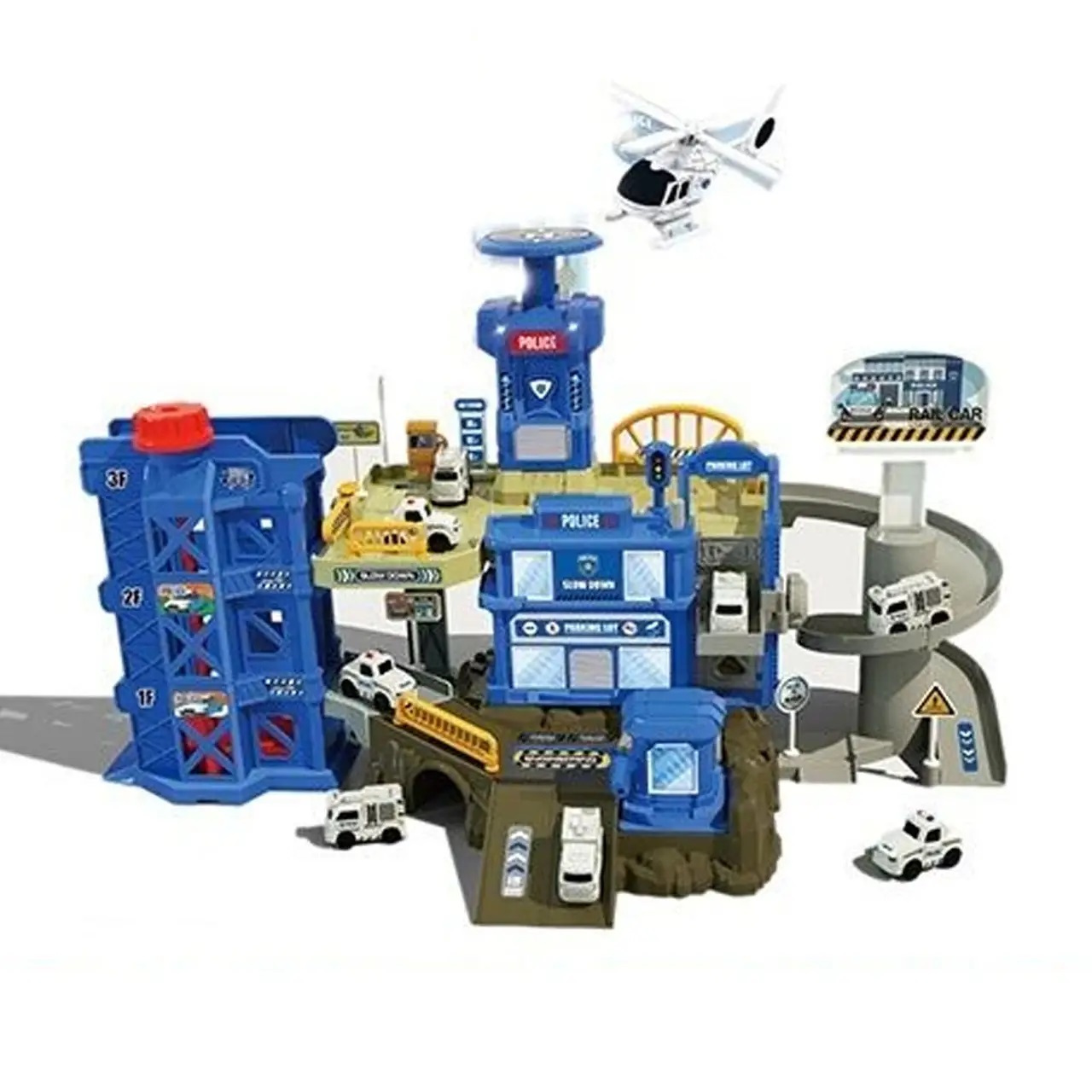В комплект входит тематический транспорт (3 машинки и вертолет), наклейки для украшения парковки и дополнительные аксессуары, которые придадут игре большую реалистичность.