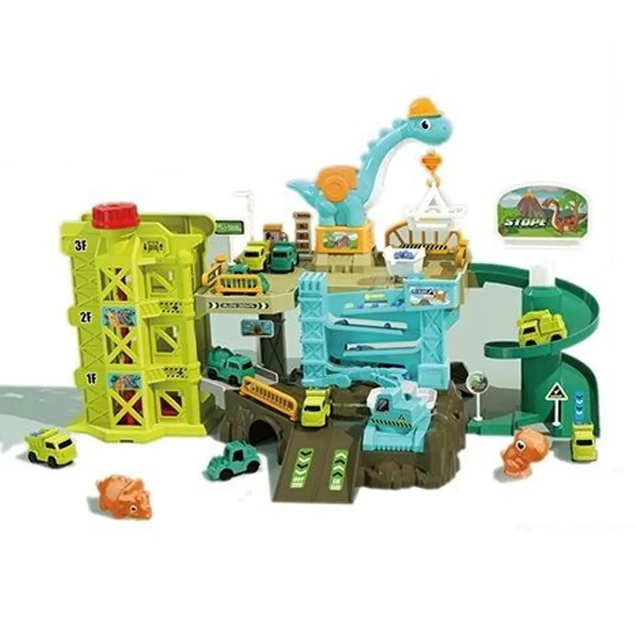 В комплект входит тематический транспорт - 4 строительные машинки, 2 игровые фигурки динозавров, наклейки для украшения парковки и дополнительные аксессуары, которые придадут игре большую реалистичность.