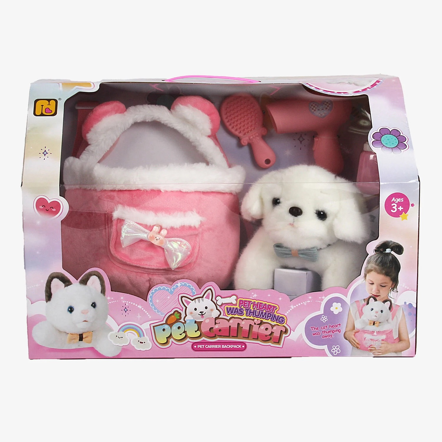 Мягкая игрушка Собачка, звук сердцебиения, сумка-переноска, бутылочка, фен, щетка. Белый (156778)