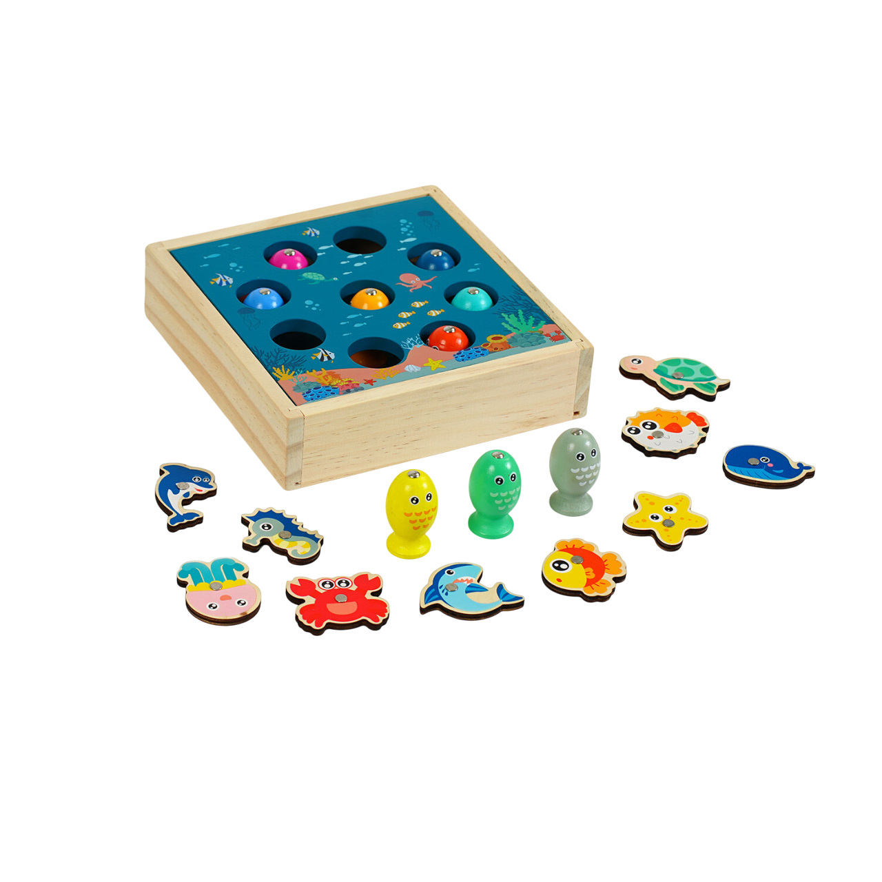 Интересная деревянная игра для самых маленьких, которая легко превратит ребенка в ловкого рыбака! Выполнена в виде игрового поля с тематическими рисунками. Съемная платформа имеет 8 отверстий для больших рыбок. Заполните отверстия соответствующего цвета и начинайте рыбачить. Задачей ребенка будет поймать каждую рыбку с помощью магнитной удочки.