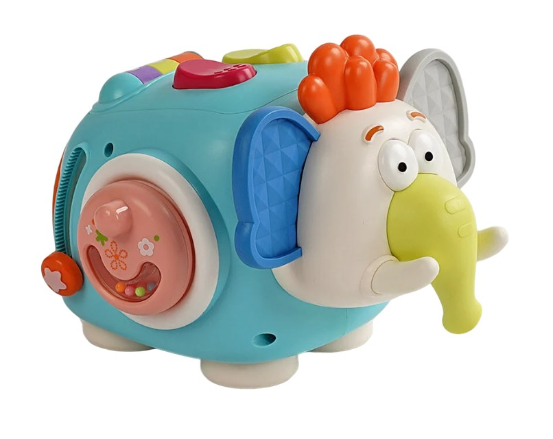 У малышей прорезаются зубки и портится настроение? Тогда подарите ей забавного цветного слоника, который не даст малышу рюмсать и скучать! Корпус игрушки выполнен из прочного пластика. А уши, хобот, клыки и хвост — резиновые. Уши с рельефной поверхностью можно использовать в качестве прорезывателя. Подвижный барабанчик с буквами и цифрами складывается как пазлы. Подвижные элементы игрушки выполняют функцию трещотки. Кроме этого, малыш может разминать пальчики, нажимая кнопки на слонике.