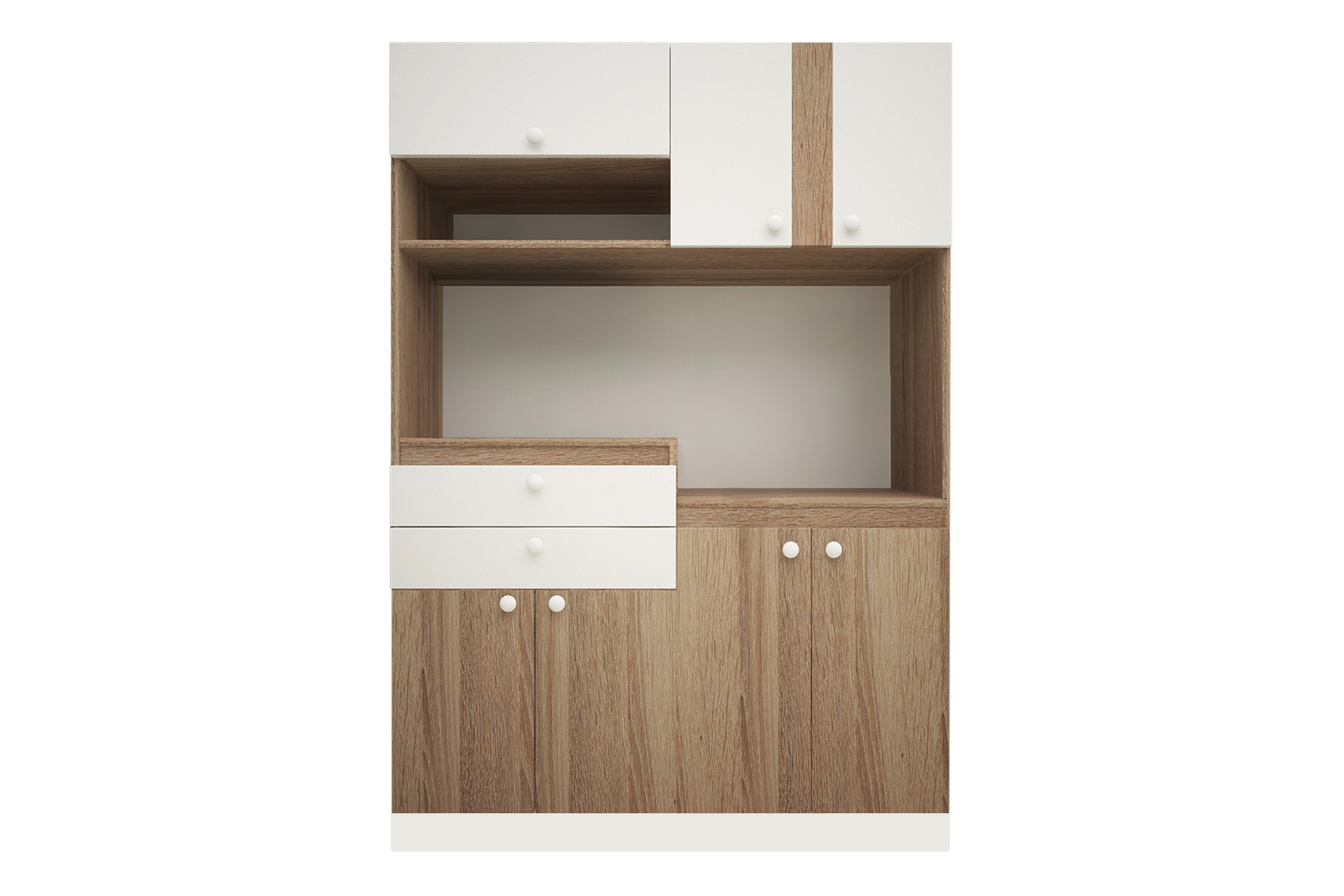 Кухонний гарнітур GraniteAlcove поєднує функціональність і простоту, що робить його практичним вибором для будь-якої кухні. Верхня частина містить декілька ніш з відкритими полицями та секціями за дверцятами, які можна використати для зберігання посуду, спецій чи дрібної побутової техніки. Центральна зона гарнітура призначена для розміщення побутової техніки або робочої поверхні для приготування їжі. Нижня частина кухні обладнана двома висувними шухлядами для столових приборів і кухонного приладдя, а також містить кілька закритих відсіків із полицями, що зручно для зберігання каструль, сковорідок або господарських дрібниць.