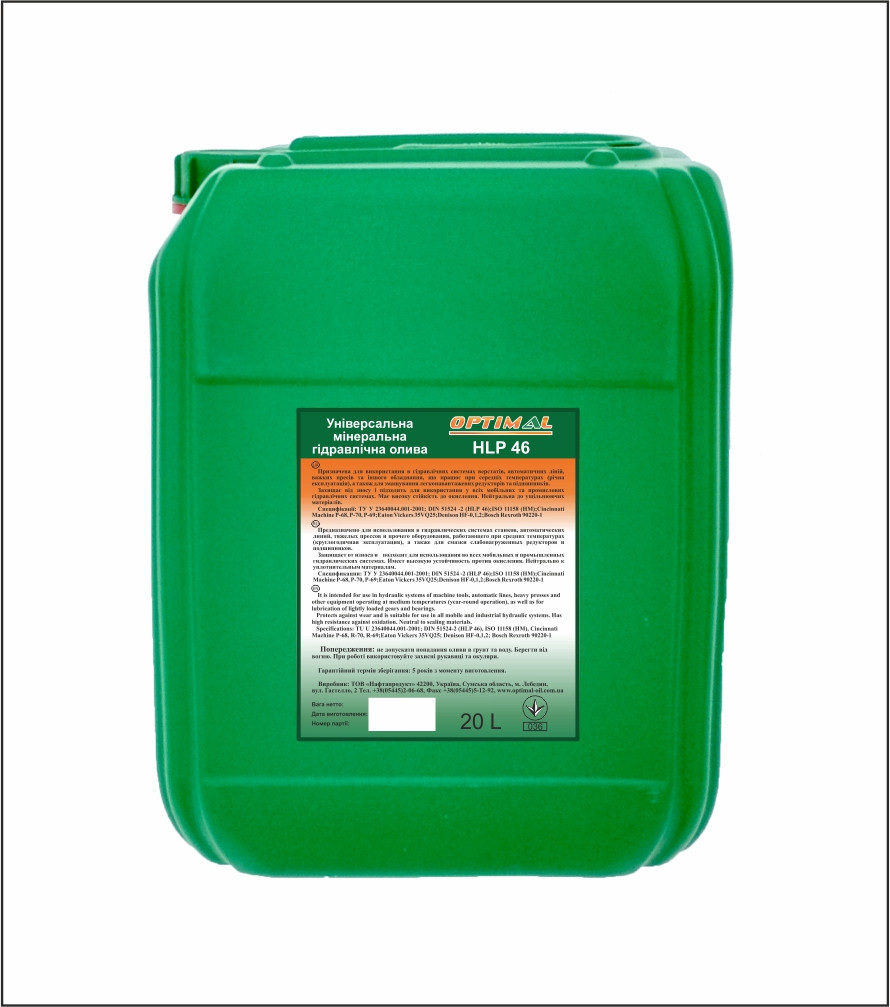 ОPTIMAL HLP 46 — универсальное минеральное гидравлическое масло Предназначено для использования в гидравлических системах станков, автоматических линий, тяжелых прессов и прочего оборудования, работающих при средних температурах (круглогодичная эксплуатация), а также для смазки слабонагруженных редукторов и подшипников. Защищает от износа и подходит для использования во всех мобильных и промышленных гидравлических системах. Имеет высокую устойчивость против окисления. Нейтрально к уплотнительным материалам. Спецификации: DIN 51524 -2 (HLP 46) ISO 11158 (HM) Cincinnati Machine P-68, Р-70, Р-69 Eaton Vickers 35VQ25 Denison HF-0,1,2 Bosch Rexroth 90220-1