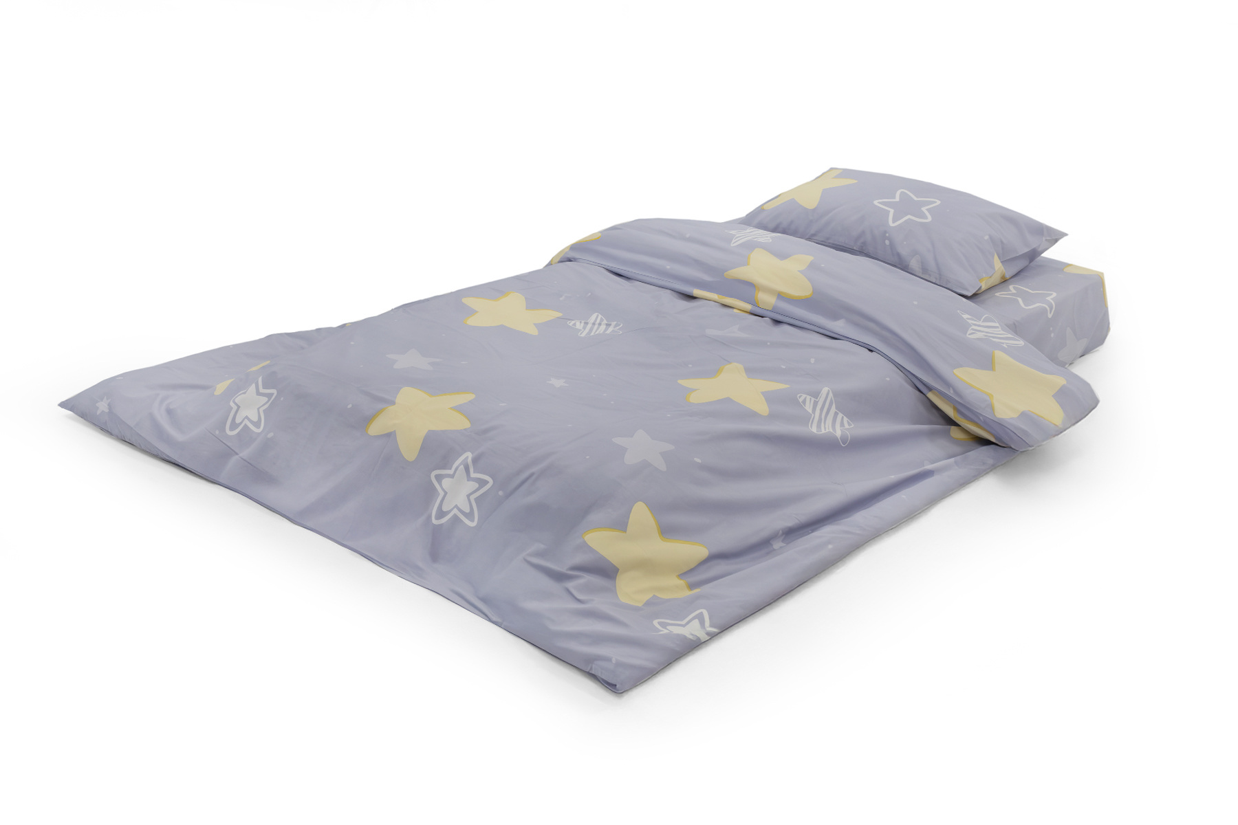 Постільна білизна з милим зоряним принтом на ніжному блакитно-лавандовому фоні. Великі жовті зірочки поєднуються з білими контурними зірками, створюючи відчуття чарівної казки. Такий дизайн ідеально підходить для тих, хто хоче додати трохи мрійливості у свою спальню. Легка, весела та затишна — ця білизна створена для найсолодших снів.