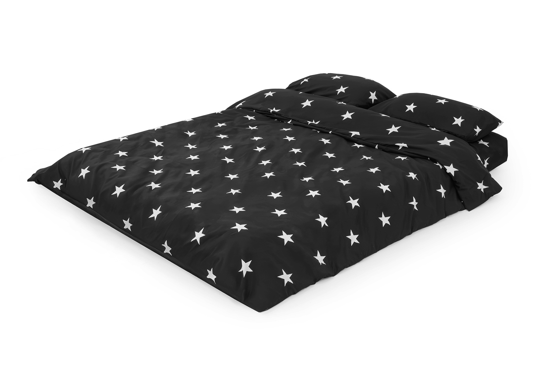 Постільна білизна захоплює своїм контрастним дизайном: глибокий чорний фон, прикрашений білосніжними зірками, створює відчуття нічного неба прямо у вашій спальні. Такий малюнок додає інтер'єру сучасності та виразності, перетворюючи кожен сон у затишну подорож серед зірок.