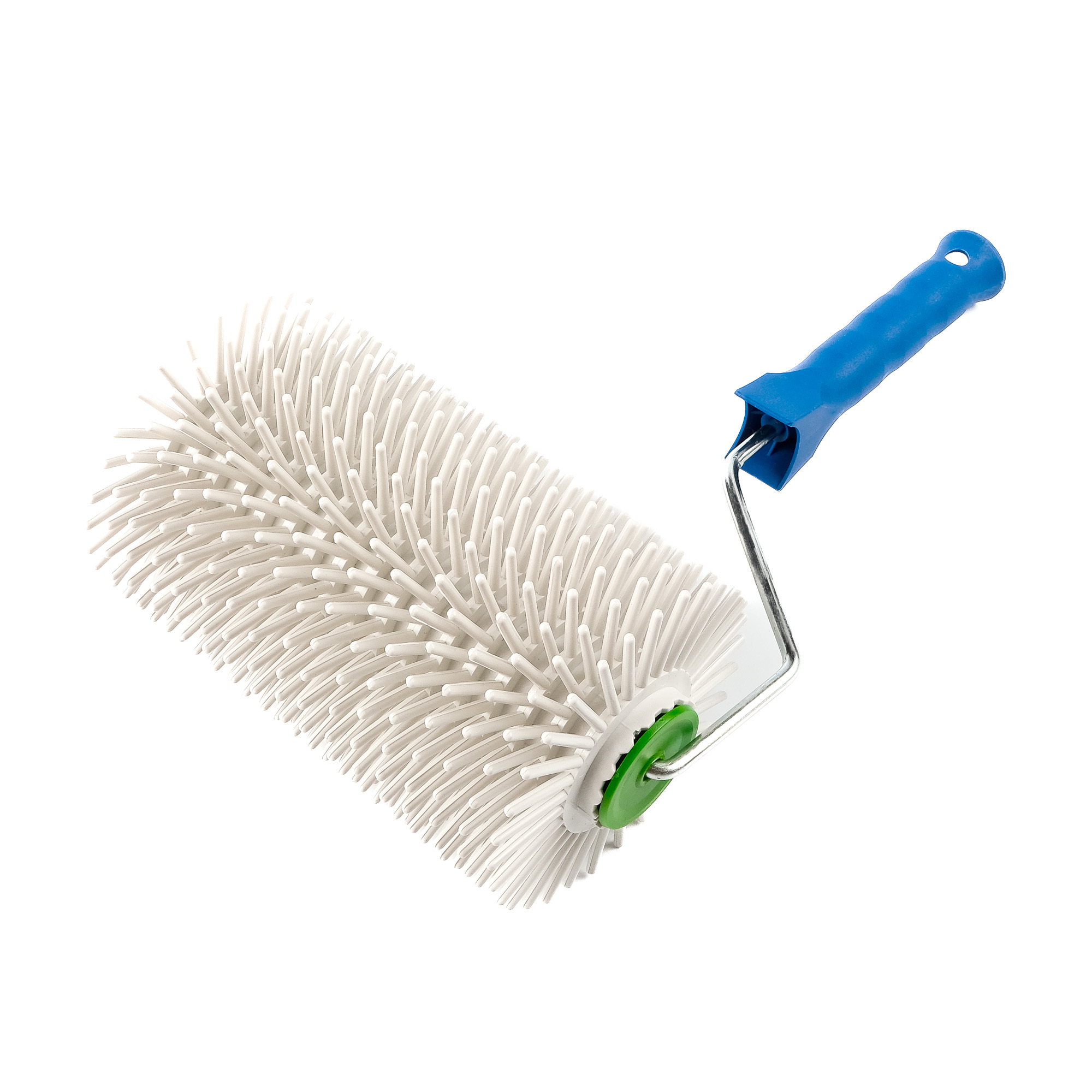 Основание валика изготовлено из износостойкого пластика, обеспечивающего долговечность. Длина иголок в 30 см, что позволяет достичь максимального проникновения в смесь и эффективного удаления воздуха. Металлический стержень с пластиковой рукояткой, оснащённая возможностью крепления телескопической ручки для удобства работы на больших площадях.