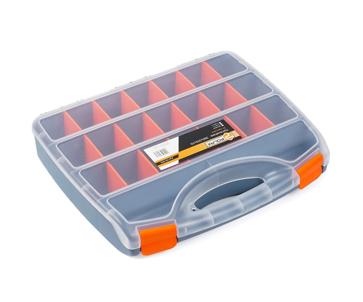 В таком органайзере удобно х ранить и транспортировать необходимый инструмент и приспособления, необходимые для работы в быту, в любой мастерской и на строительном участке. Органайзер имеет 21 секцию, оснащен замками-защелками на крышке и комфортной ручкой. Прозрачная крышка обеспечивает отличный обзор всего содержимого органайзера.